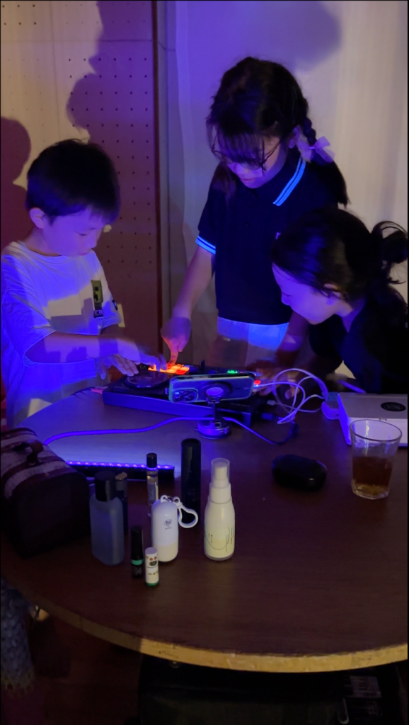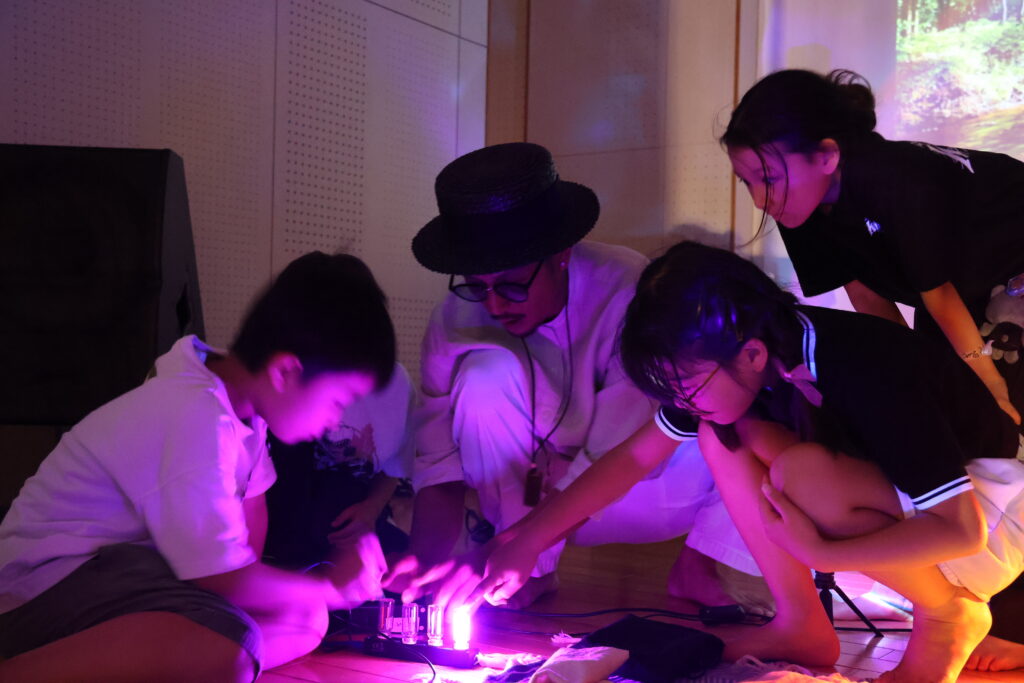子どもたちはDJ機材に触れ、自分の手で音を変化させる体験を行った。フェーダーを動かすたびに空間の質感が変わり、その変化に対する驚きと喜びが自然な反応として表れていた。音を操作する行為が、そのまま空間に影響を与えるという実感が共有された。