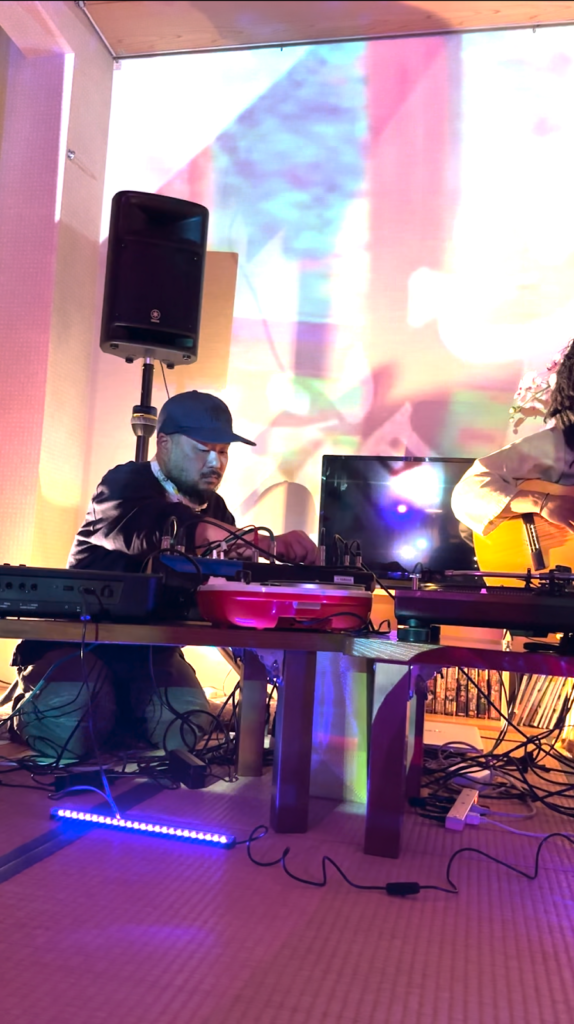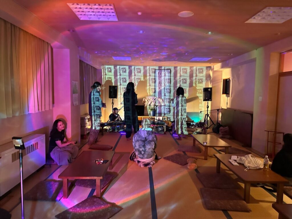 Working alongside a local creative crew, I transformed the lounge area of Mizusawa Onsen into an immersive relaxation space. While StarRo and the local team provided music and physical healing, I focused on visual spatial direction. I projected serene footage of Lake Tazawa—captured during my stay—onto the darkened walls, overlaying the text “Mizusawa Onsen” as a tribute to the local atmosphere and beauty.