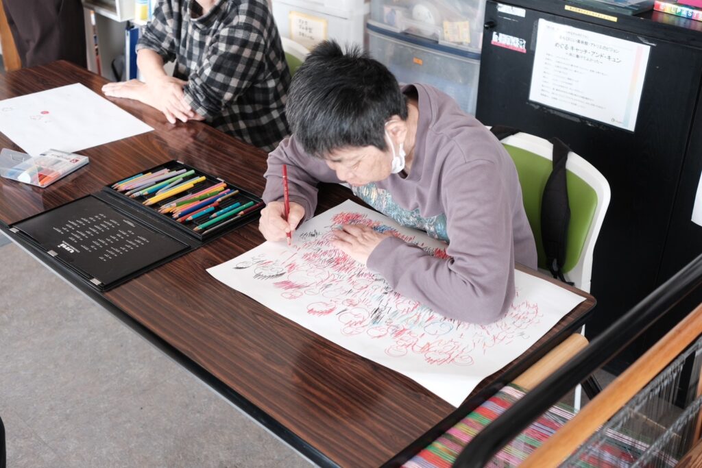 会話の中で、一人の利用者の方に音の振動を身体で感じる体験を共有した。その刺激をきっかけに、彼女が「水の音」のイメージを言葉にし、紙に描き出していくプロセスを間近で感じることができた。感覚の共有から新たな表現が立ち上がる、W.A.P.P HEIGHTSらしい「Presence」の共有となった。