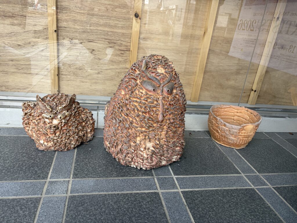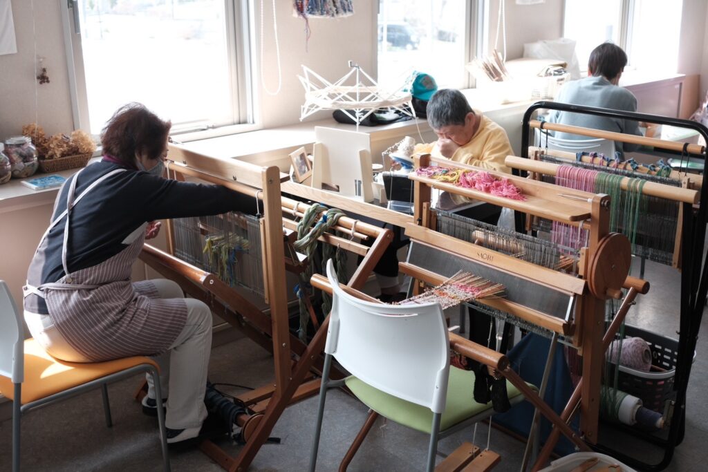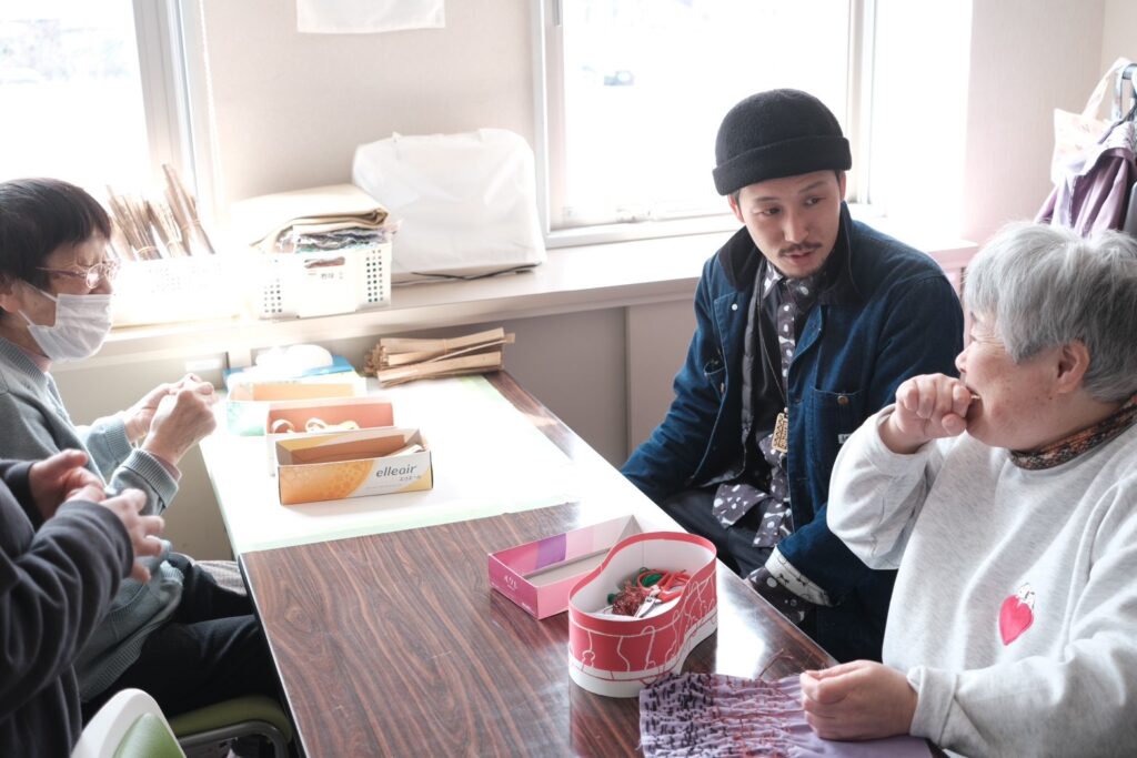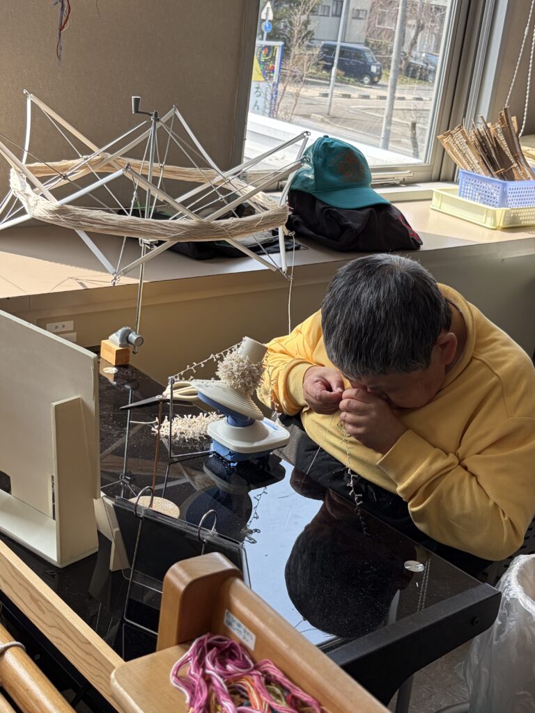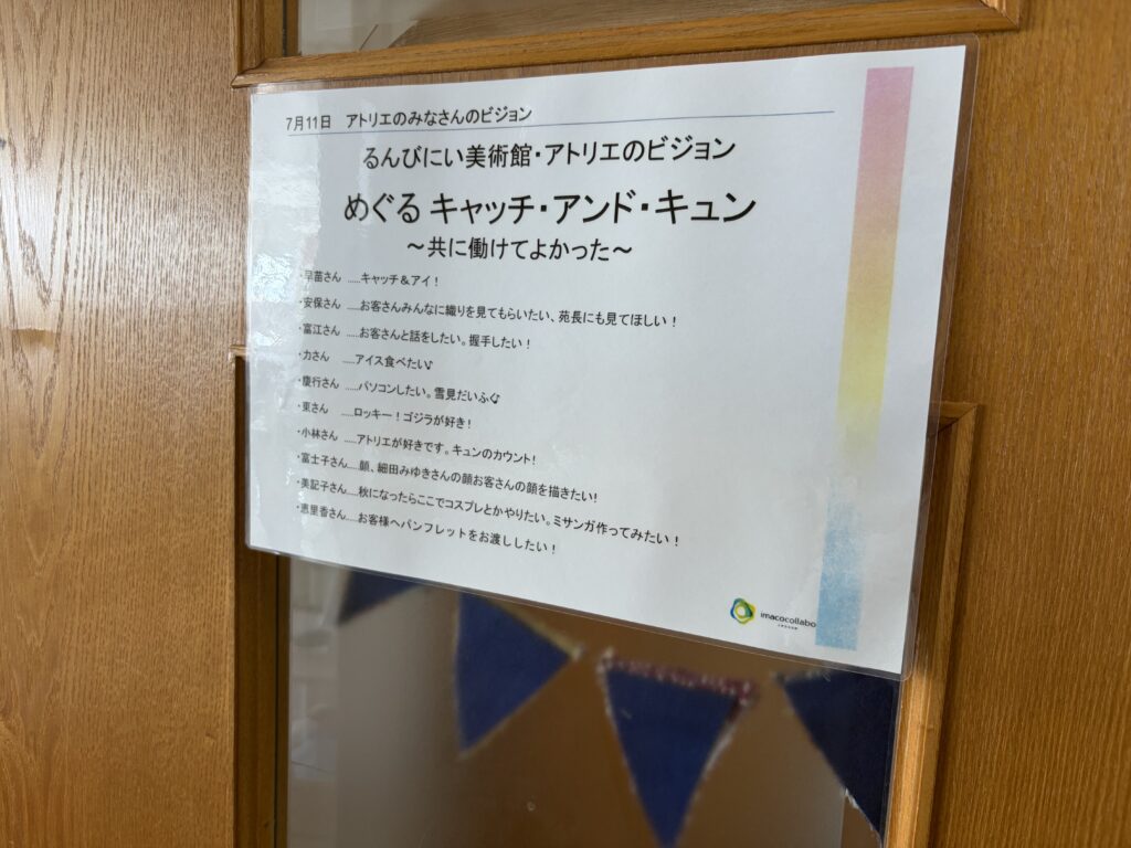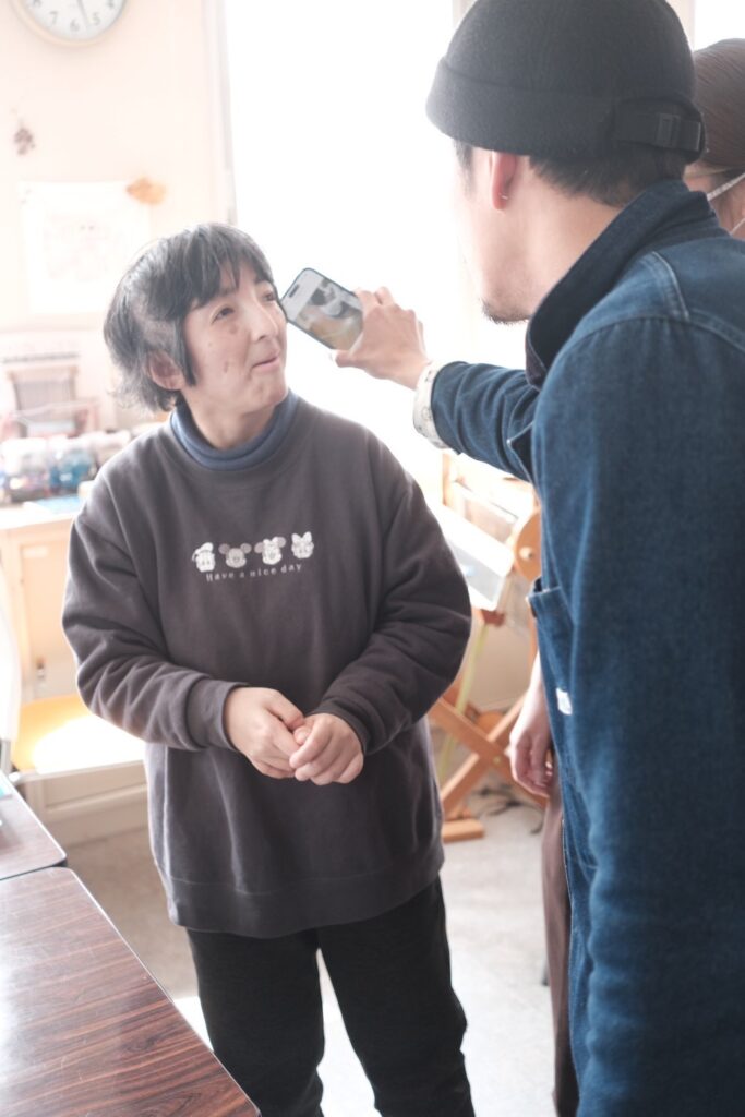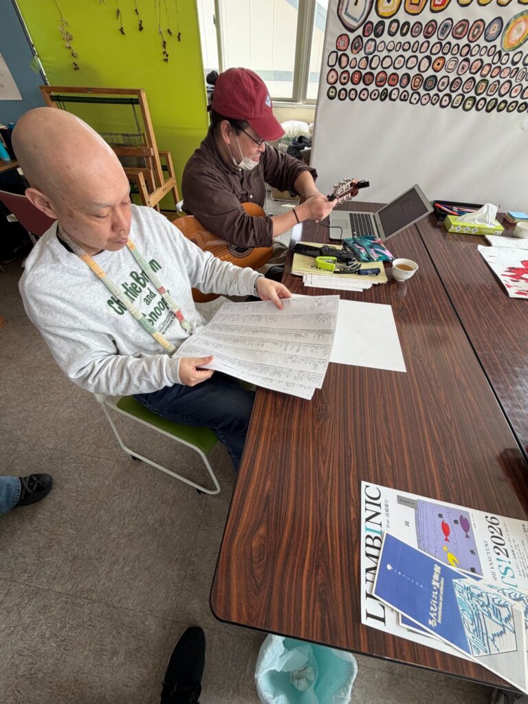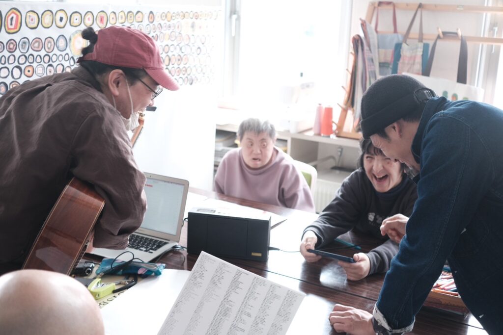 るんびにい美術館に到着してまず目を引いたのは、外観に施された可愛らしいアート。一歩足を踏み入れると、手作りの柔らかな焼き物や、作家さんの写真と丁寧な解説が添えられた素敵な作品たちが迎えてくれた。作品に囲まれた心地よいカフェを通り抜け、階段を上がった2階にあるのがアトリエ「まゆ〜ら」だ。利用者の方々との挨拶、そしてラジオ体操を経て、それぞれが自身の作業へと移っていく穏やかな時間が流れていた。支援員や利用者の方々と楽しくお話しする中で、言葉と音を重ねる即興的な「セッション」を見せていただく機会があった。その自由な表現があまりに面白かったので、僕もスマホのDJアプリを引っ張り出して、音を多層的に重ねて一緒にちょっと遊ばせてもらった。